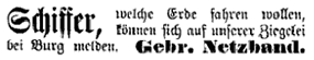 Adolf Ferdinand überließ allerdings später seinem Bruder Friedrich III. die Ziegelei und errichtete für sich selbst eine neue am Ende der Deichstraße links (Gelände des heutigen Anglerclubs). Die Söhne Albert und Emil übernahmen zunächst zusammen eine Ziegelei in Burg. Der Ziegelstempel „Gebr. Netzband“ ist den beiden zuzuordnen.