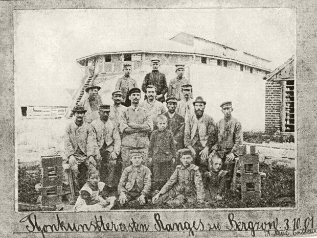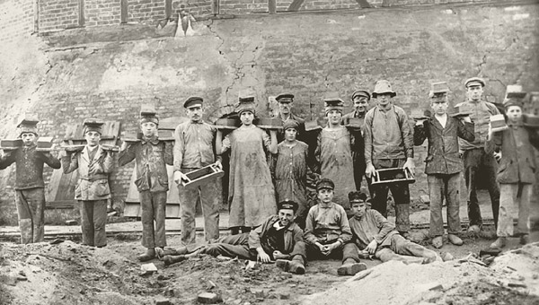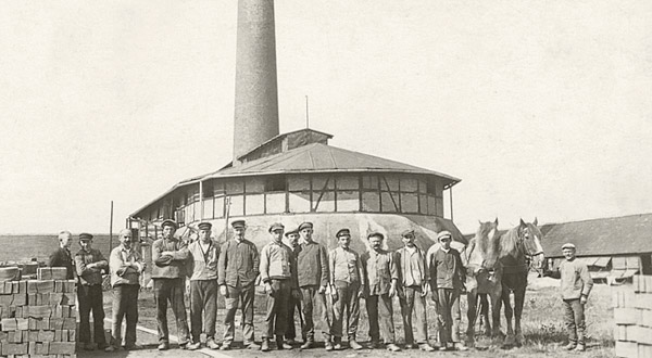 Ziegeleiarbeiter*innen, Jugendliche, Kinder und Ziegeleibesitzer. Hist. Fotos.