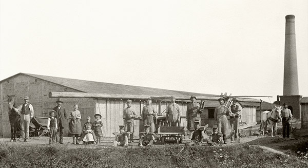 Ziegelei Löber 1892. 2. von links: Ziegelmeister Friedr. Blankenburg mit Frau Friederike (sitzend) und den Kindern Otto, Ida u. Anna. Im Vordergrund sind Abtragejungen zu sehen, die Rohlinge mit Hilfe von kleinen Brettern, eins auf dem Kopf und zwei in den Händen, zu den Trockenschuppen transportierten. BILD vergrößern / oder Bild-Klick
