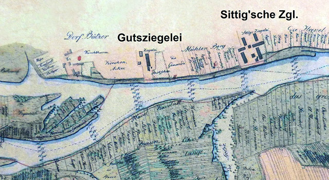 Der neue Eigentümer Carl Gotthelf Sittig entwickelte die Ziegelei weiter, so dass die auf Seite 10 abgebildete Havel-Karte (siehe unterhalb vom Text ...) von 1833 eine Bebauung mit 9 Gebäuden zeigt. Zurück zum Text oben ...