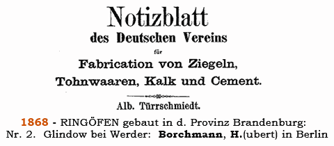 Notizblatt d. Deutschen Vereins für Fabrication von Ziegeln ec. 1868, RINGÖFEN gebaut 1868 in d. Prov. Brandenburg: Nr. 2. Glindow bei Werder: Borchmann, H. (Hubert I.3.2) in Berlin (Quelle: Kunstbibliothek Berlin)