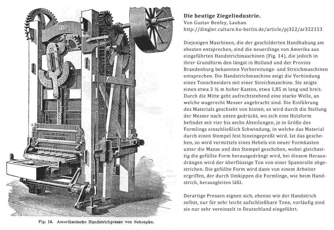 Maschinenziegel, Handstrich-Presse: WALTON PATENT. Nach amerikanischem Vorbild. Fundort: Hermsdorf, Abriss-Sanierung. Wahrscheinlich Probeziegel mit einer Maschine auf der Hermsdorfer/ Lübarser Ziegelei um 1890-1900. Abmessung: 25x12x7 cm, der Press-Stempel hat an der linken Kopfseite Material mitgenommen, Materialquetschungen und Brüche im mitteleren Längstquerschnitt des Ziegels, viele Absetzmarken an Unter- und Längstseite. Der Press-Stempel WALTON PATENT deutet auf eine Maschine aus den USA hin. Es waren keine Nachweise auf den Hersteller möglich. Zum Typ der Maschine ist in einer Beschreibung; Dingler, Polytechn. Journal 1907 abgedruckt.