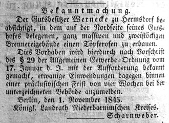 Zusammenfassung: Carl Wernecke kauft vermutlich das Gut Hermsdorf, um dort eine hochwertige Ziegelei, die anfänglich auch Töpferwaren und Ofenkacheln herstellte, aufzubauen. Das setzt voraus, daß er um das sehr gute Tonvorkommen (Septarienton) wußte und den guten Waldbestand des Gutsbezirkes mit einkalkulieren konnte, für die Brennstoffversorgung der Ziegel- und Töpferöfen. Ihm war es möglich, an seinen Betrieb auch erfahrene Ziegler aus weiter entfernten Regionen zu binden, wie z.B. Mecklenburger. Daraus ergibt sich, daß Carl Wernecke selber über gute Töpfererfahrungen verfügte, sodaß auch jüngere Praktikanten wie Albrecht Türrschmiedt bei ihm gelernt haben. Hinzu kommt eine Vernetzung mit den bauausführenen Architekten in Berlin und ein gewisser Standortvorteil bei 2 Meilen (14 Km) zur Stadtgrenze. Diese Zusammenhänge und die technologische Entwicklung einer Ziegelei in der MItte des 19. Jahrhunderts, soll auf den folgenden Seiten detailliert nachvollzogen werden.