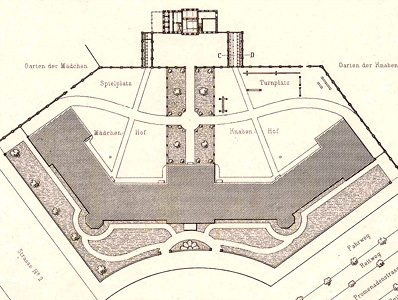 12) Erziehungshaus in der Hasenhaide geplant, (später als Erziehungshaus am Urban bezeichnet, siehe Karte unten von 1885) — Kriegsschaden, abgerissen — Zeitschrift für Bauwesen XIV, Seite 298.